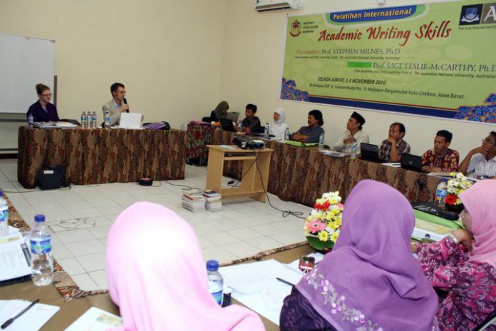 Pertanyaan tersebut mengawali presentasi Prof. Stephen Milnes, Ph.D, salah seorang Konsultan The Academic and Skills Learning Centre Australian, The National University, Canberra, Australia, bersama Prof. Sage Leslie McCarthy, Ph.D, yang juga salah seorang Konsultan The Academic and Skills Learning Centre Australian, The National University, Canberra, Australia, saat menyampaikan materi pelatihan “Academic Writing Skill” tentang budaya penelitian (research culture). Keduanya adalah pembicara dalam pelatihan tersebut.